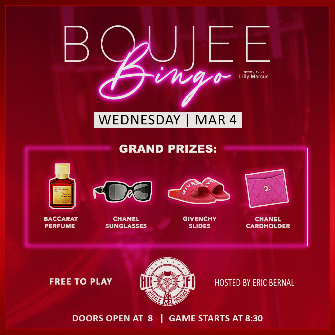 A glam‑themed night of Boujee Bingo at HiFi featuring luxury prizes, free‑to‑play games, and lively hosting by Eric Bernal. Doors open at 8, game starts at 8:30.